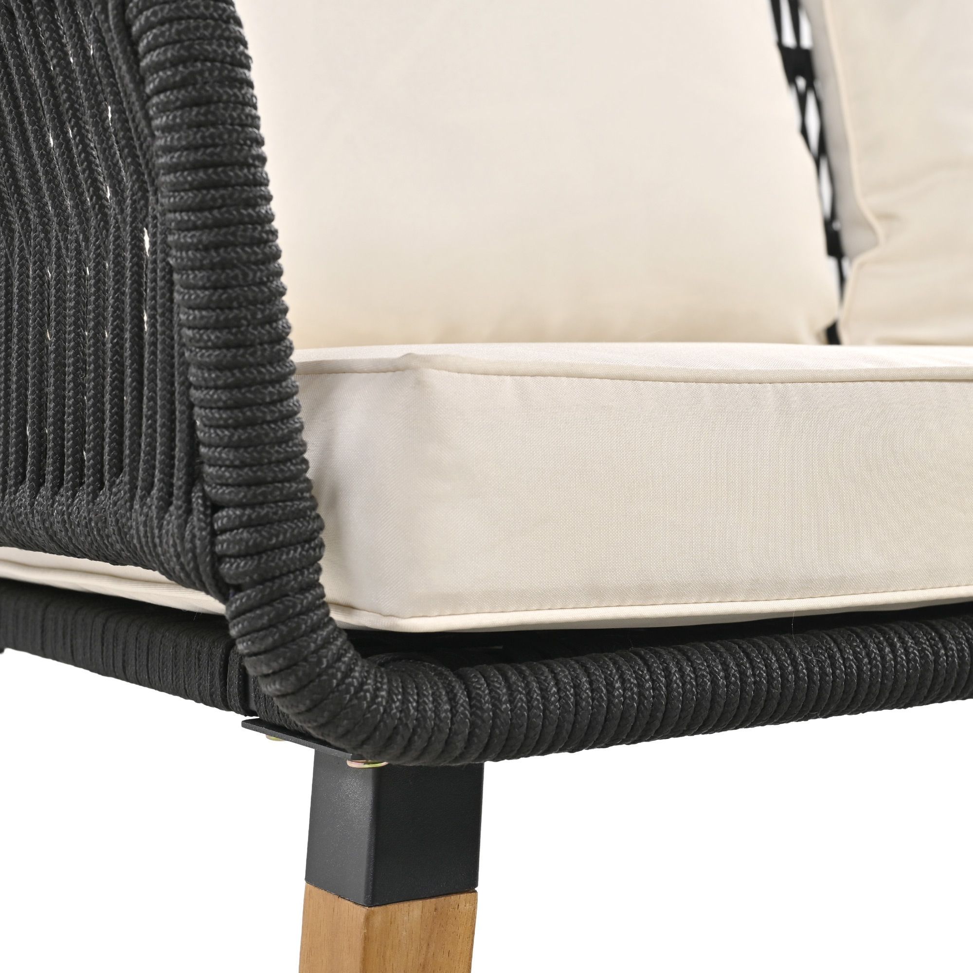 | Material | PP Rope /Metal Frame+Acacia Wood Feet/ Polyester Fabric+Foam / Acacia Wood Table |