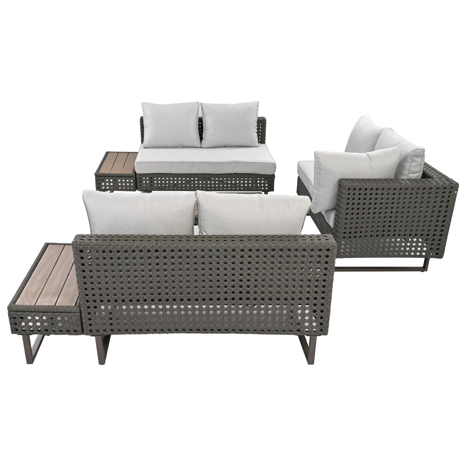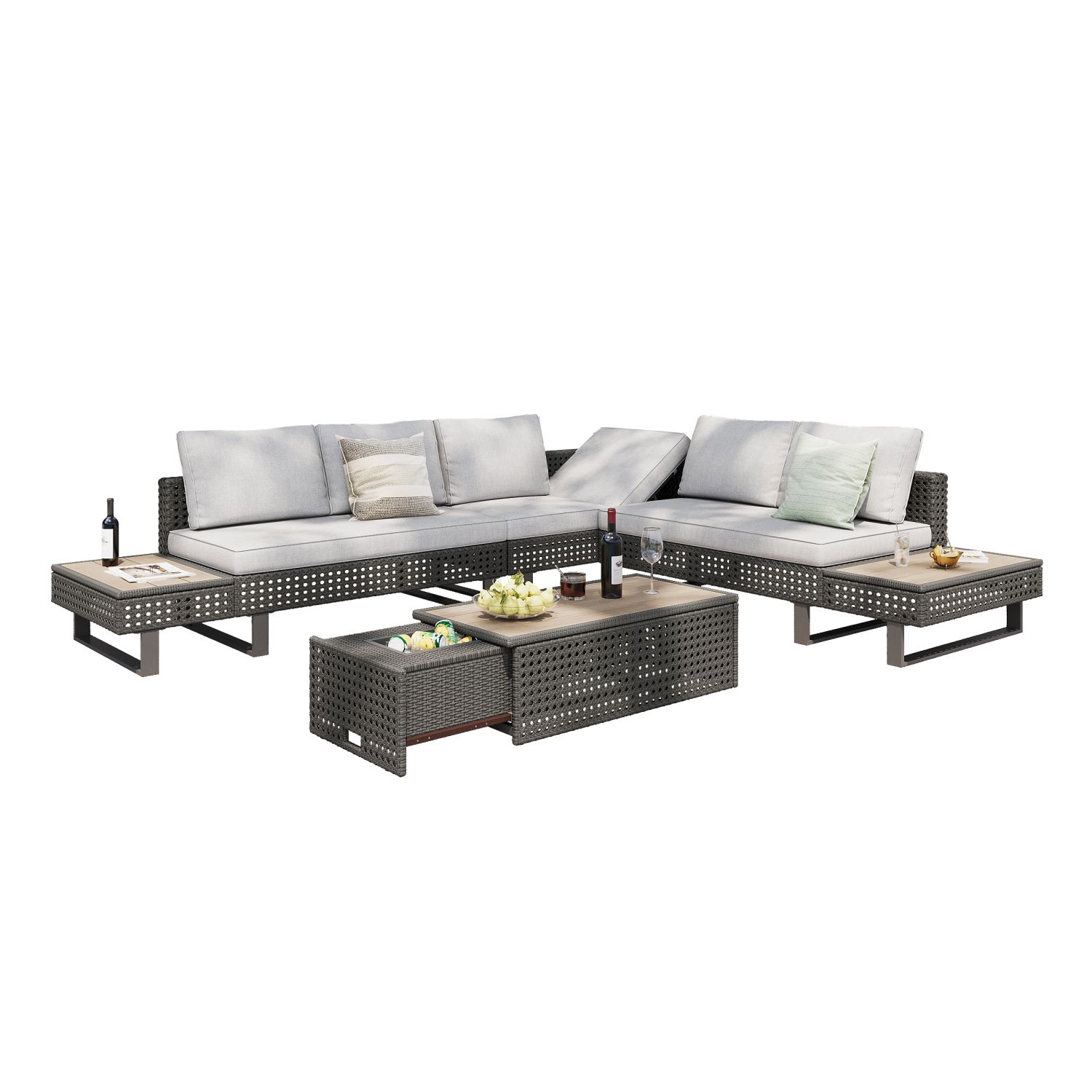 [Various Combinations] The outdoor sectional sofa set features seat clips and includes two armless sofas with side tables, one corner sofa, and one extendable coffee table. The modular design, equipped with seat clips, allows for flexible combinations according to your preferences, enabling you to transform the sofa into a bed if desired.